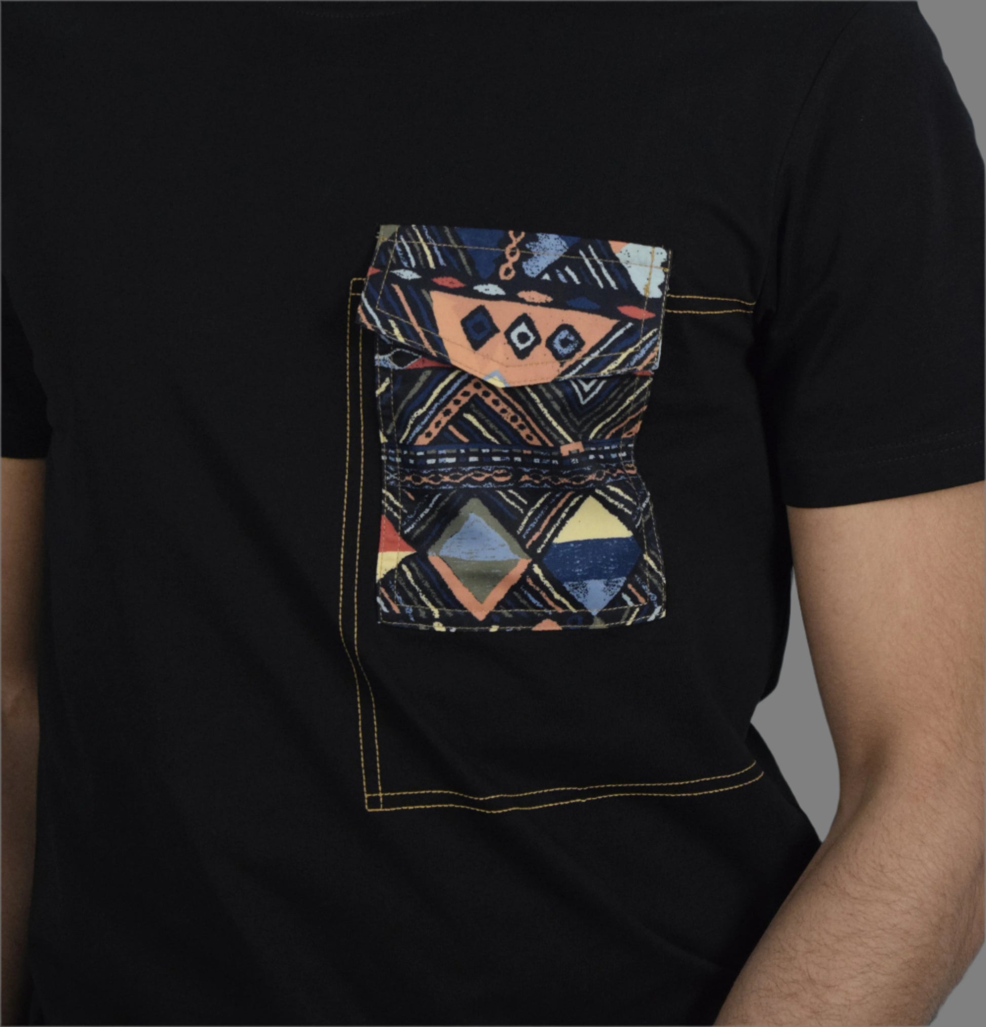 ✔️ The pocket is made of multi-colored patterned fabric, including shades of blue, orange, yellow, and black, with a striking geometric design.